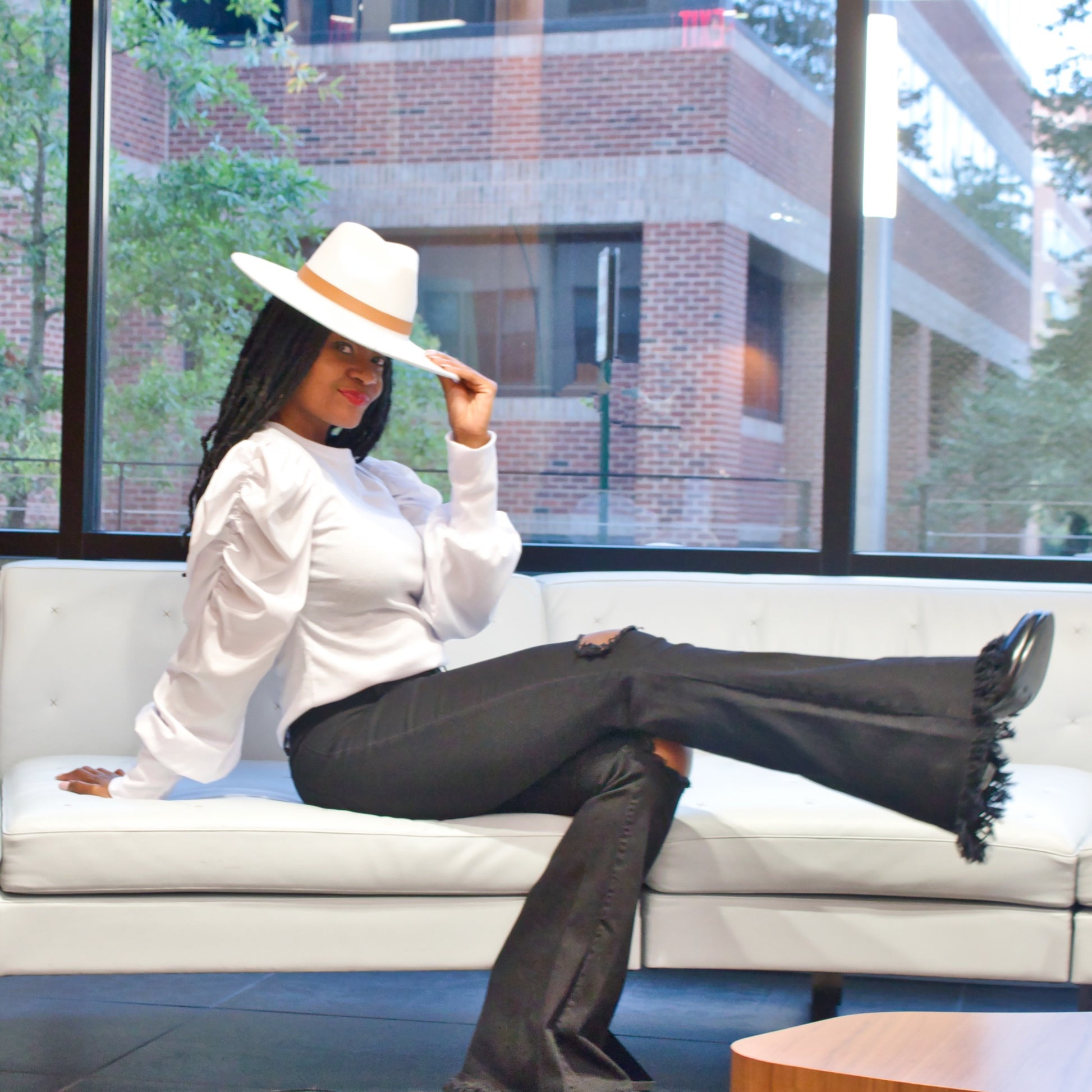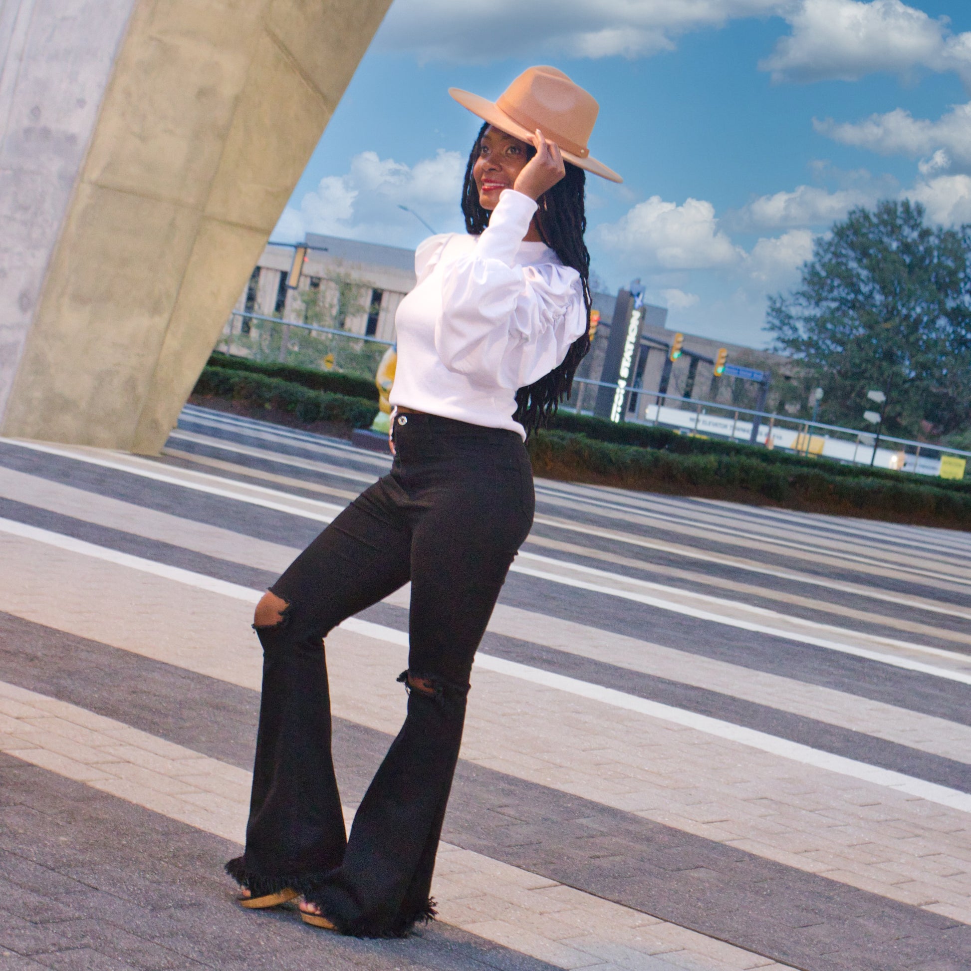 High waist black jeans with ripped knee and frayed hem. This sexy jean has stretchy fabric to hug your beautiful curves.